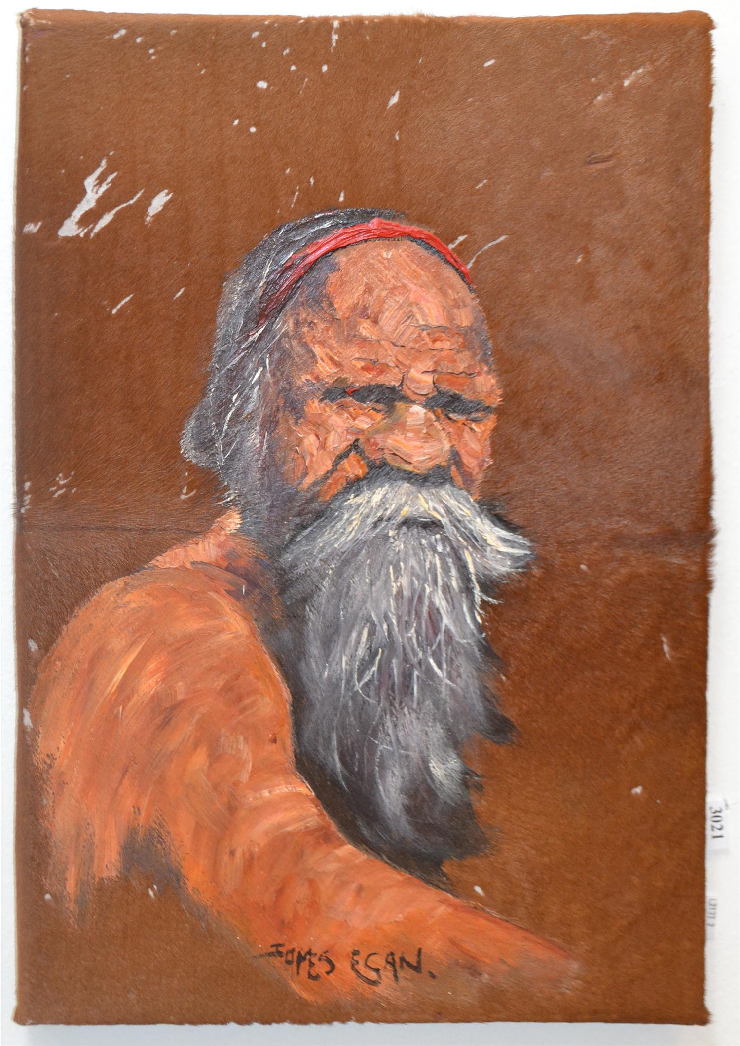 JAMES EGAN, PORTRAIT, OIL ON COWHIDE, 51 X 36CM, NO ADDITIONAL FRAMING, CONDITION: FAULTS INTEGRAL TO MEDIUM