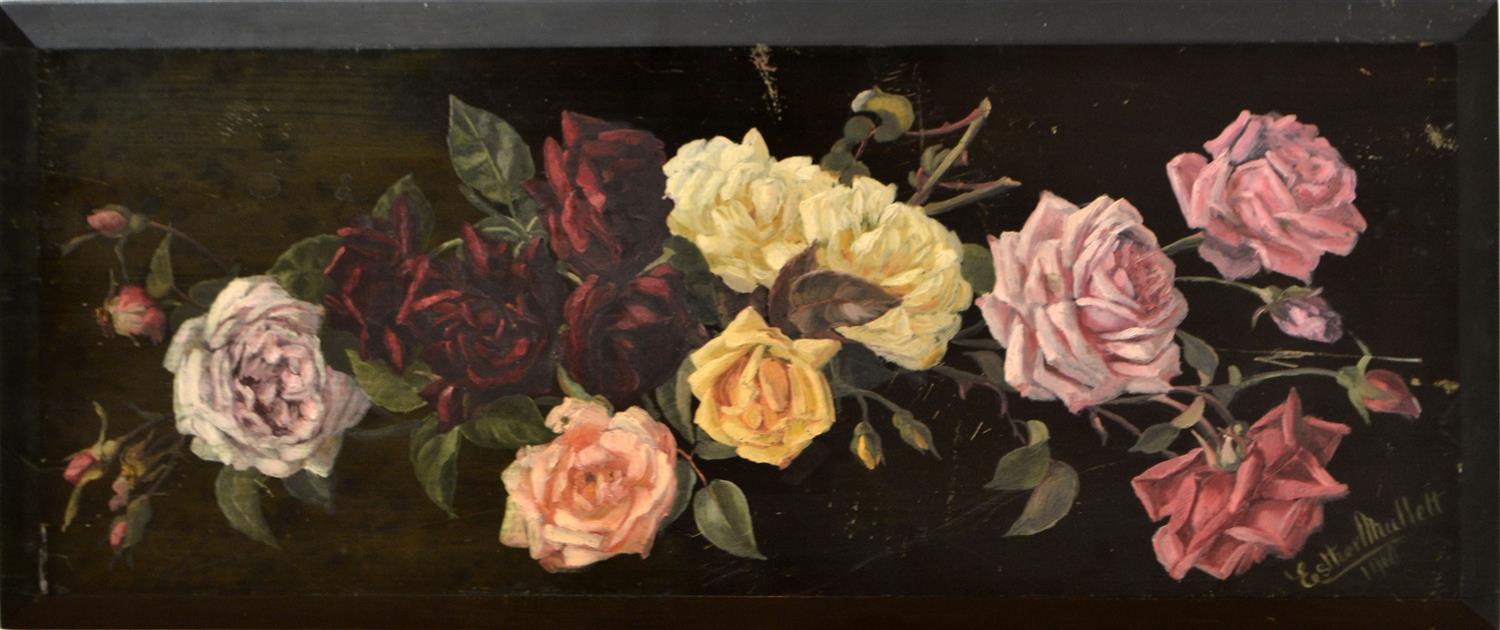 ESTHER MULLETT, FLORAL SCENE 1910, OIL ON PANEL, 35 X 81CM, CONDITION: SURFACE SCRATCHES