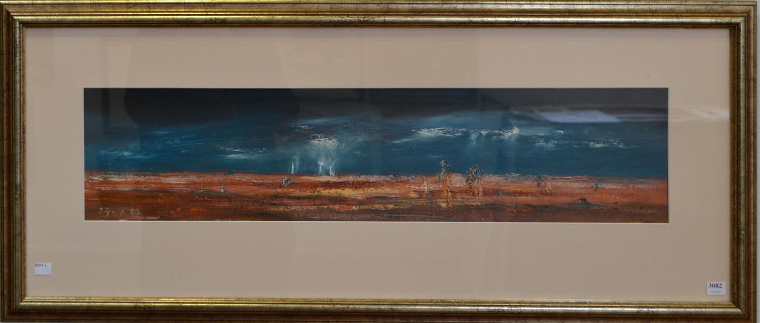 ROBERT FISHER, LIGHTENING STRIKE WILLIAM CREEK, OIL ON BOARD, 18 X 79CM, FRAME SIZE: 44 X 103CM, CONDITION: VERY GOOD