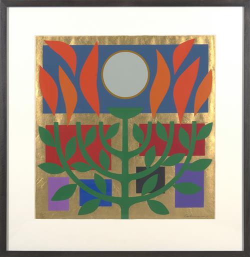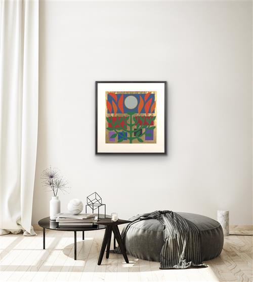 This artwork is in good condition Minor loss to the gold foil, integral to medium. Well framed, measuring 78 x 77cm