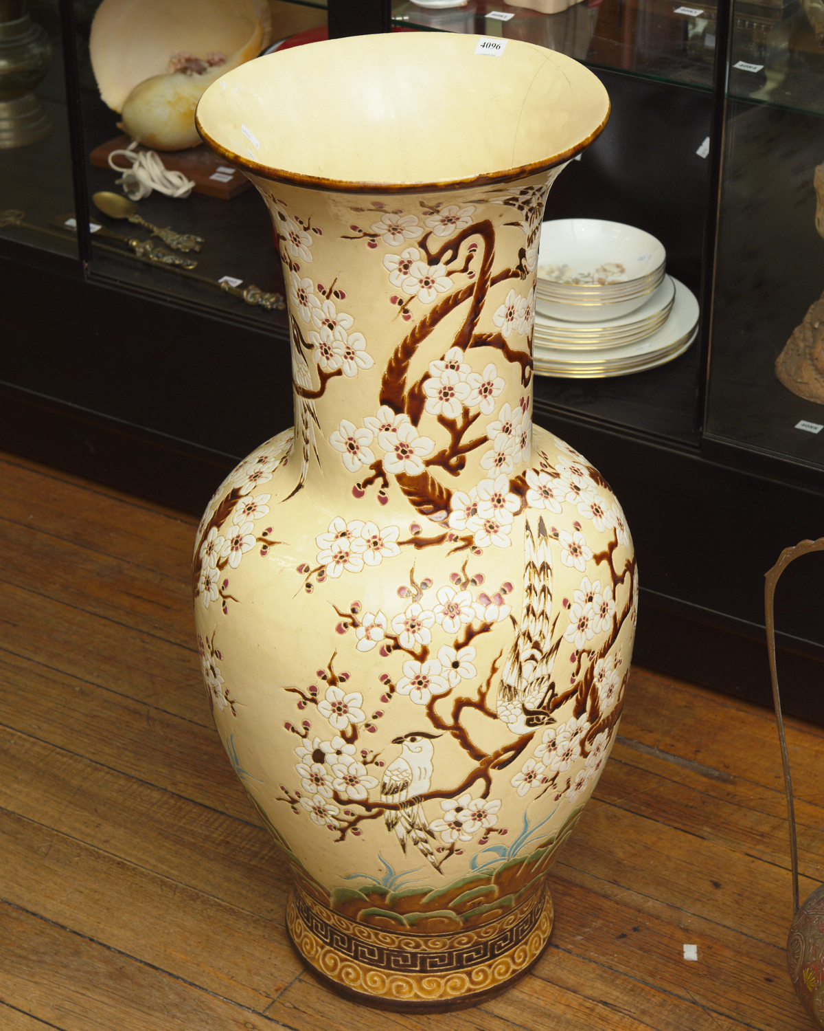 A LARGE JAPANESE EARTHENWARE FLOOR VASE (A/F, HAIRLINES), 82 CM HIGH