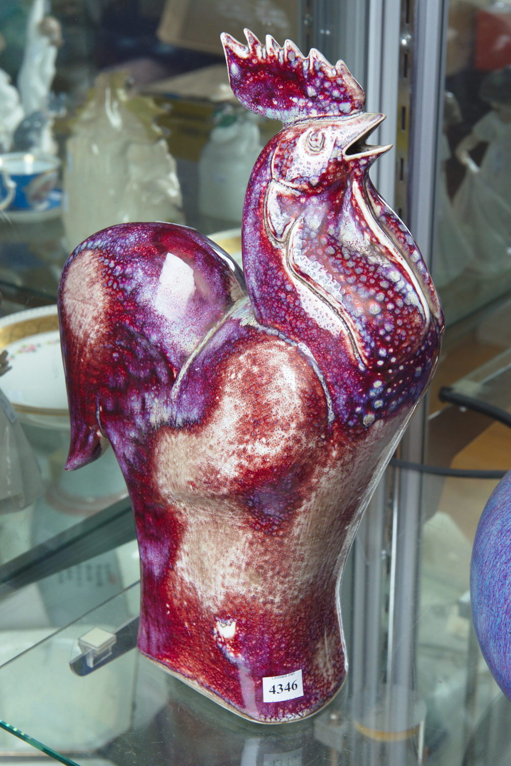 A FLAMBE GLAZED EARTHENWARE ROOSTER