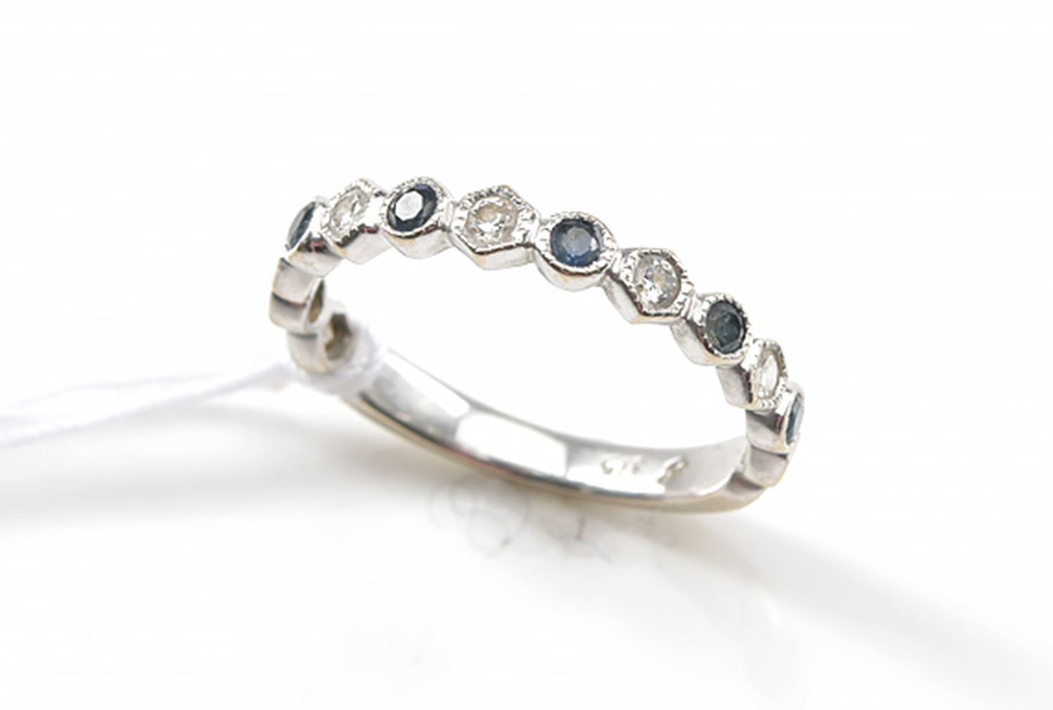 A SAPPHIRE AND DIAMOND BAND IN 9CT WHITE GOLD, SIZE K, 1.2GMS