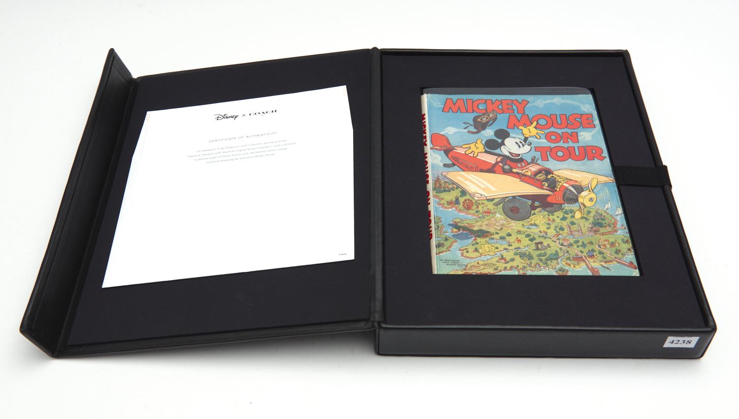 DISNEY X COACH LEATHER CASED DISNEY FIRST EDITION OF MICKEY MOUSE ON TOUR, WITH CERTIFICATE OF AUTHENTICITY.