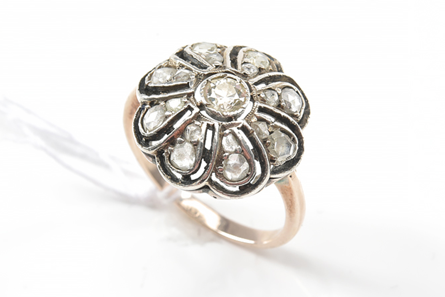 AN ANTIQUE DIAMOND RING FEATURING A ROSACE, IN 18CT GOLD, SIZE M-N, 3.5GMS