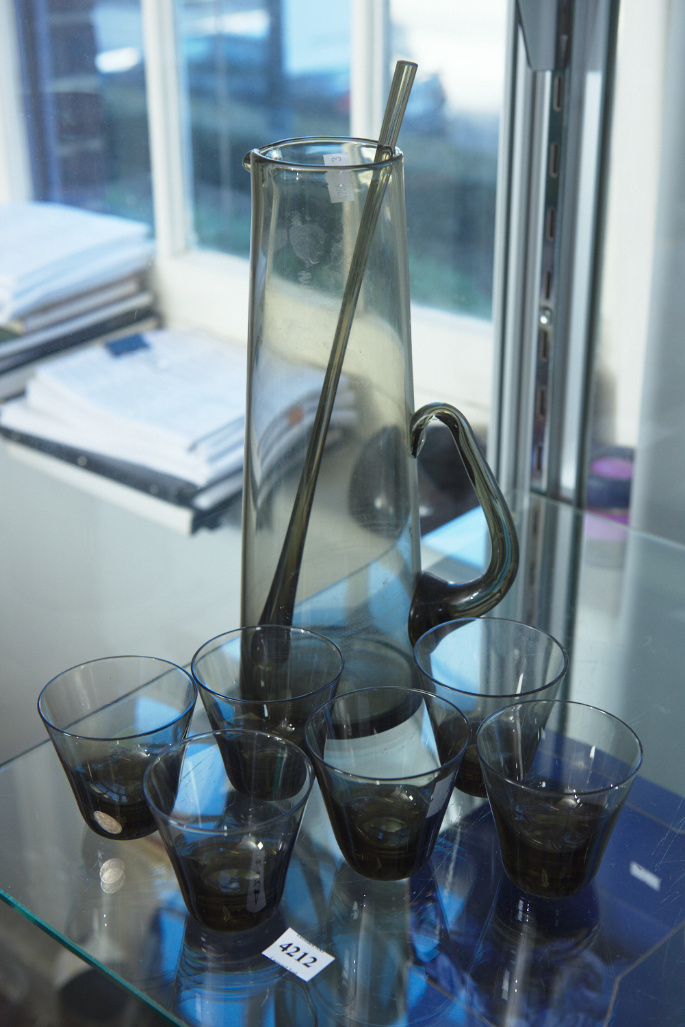 SMOKEY GLASS MARTINI SET COMPRISING JUG AND SIX GLASSES AND STIRRER