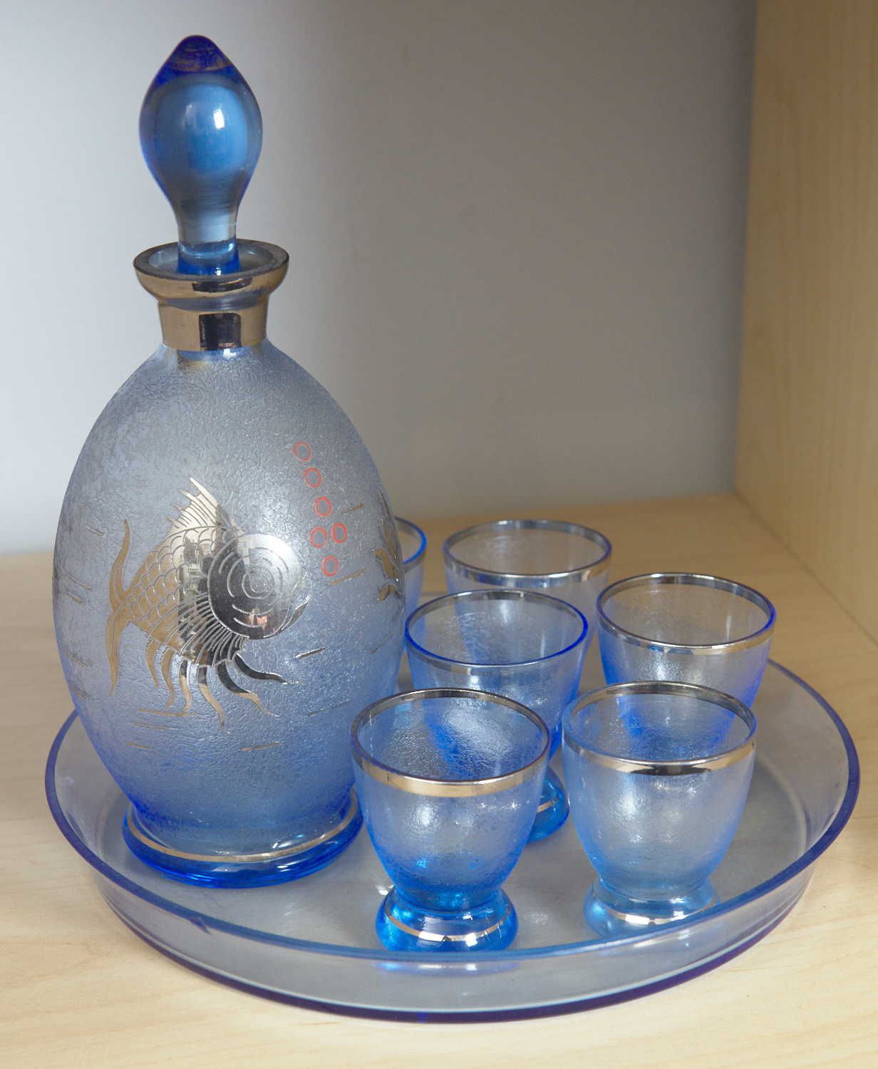 SAKE SET COMPRISING BOTTLE, SIX GLASSES AND TRAY (A/F TO TRAY)