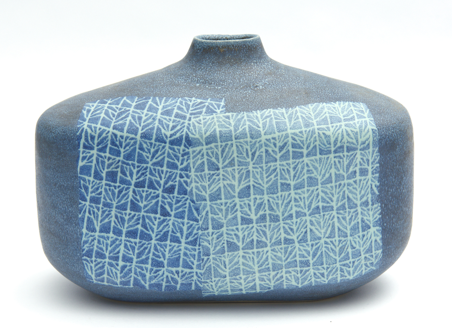 HIROE SWEN, RECTANGULAR VASE, STEEL MATT GLAZE AND OVERLAY DECORATIONS, H.20CM W.29CM