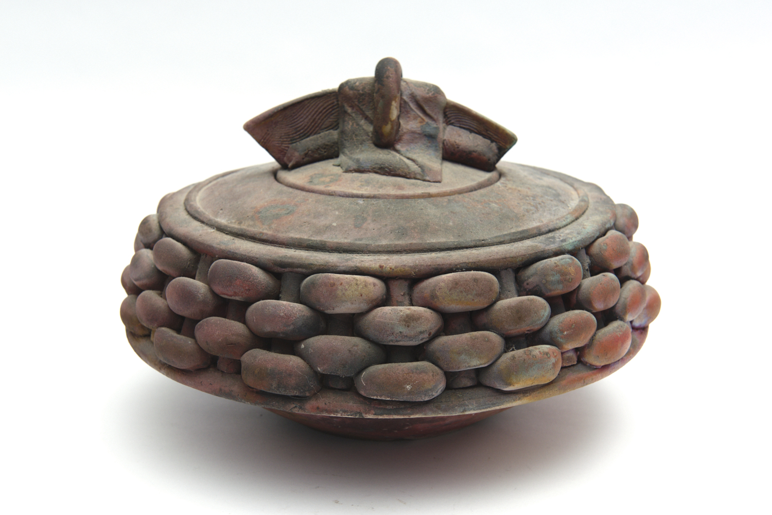 JEFF MINCHAM, LARGE LIDDED KAGOME VESSEL, 1995, RAKU FIRED DIA.30CM, H.22CM