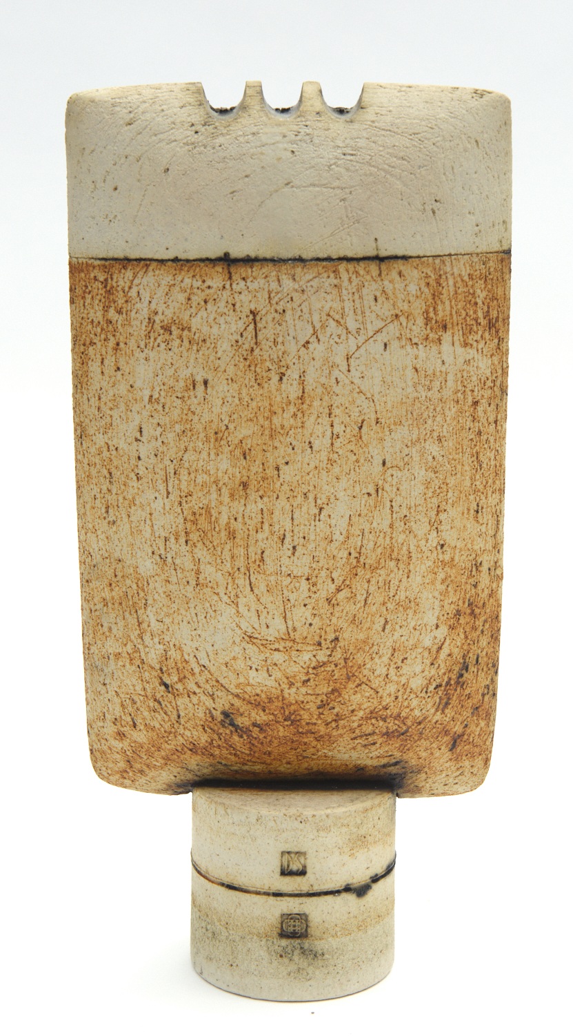 HIROE SWEN, RECTANGULAR VASE, STEEL MATT GLAZE AND OVERLAY DECORATIONS, H.20CM W.29CM