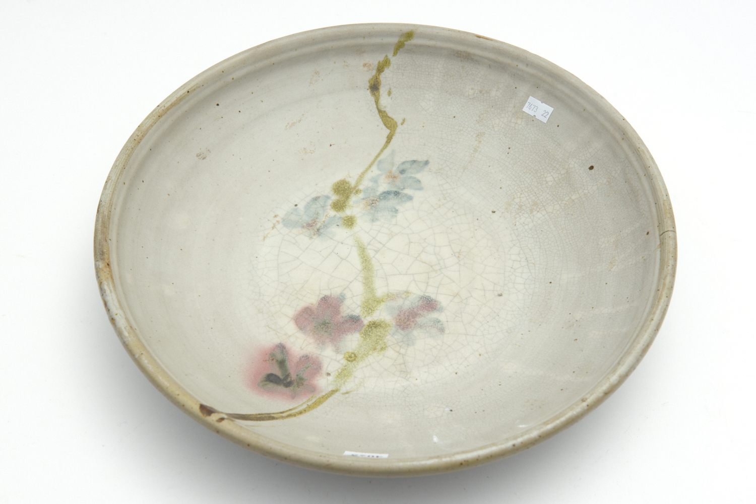 MILTON MOON, CELADON GLAZED FLORAL DECORATED BOWL, DIA.37CM