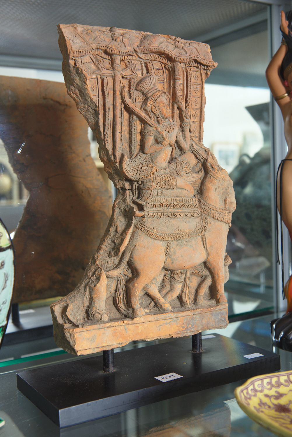 A STONE CARVING ON STAND