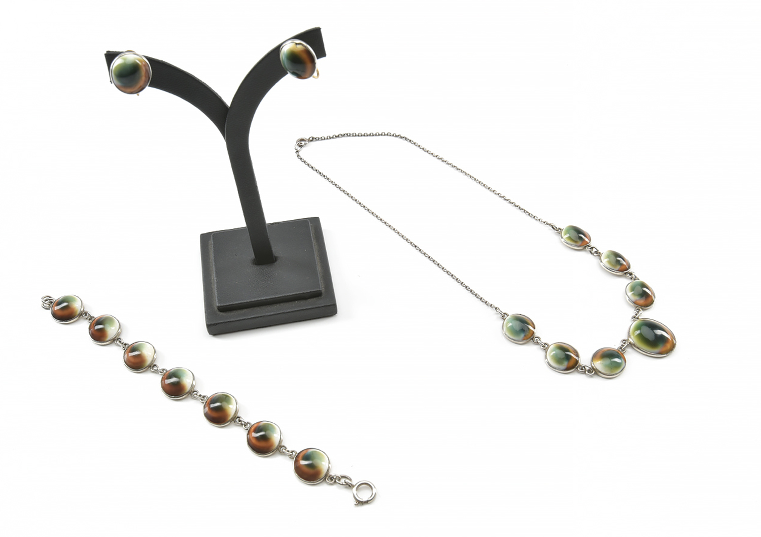 A VINTAGE SUITE OF OPERCULUM JEWELLERY IN STERLING SILVER, INCLUDING NECKLACE, EARRINGS AND BRACELET