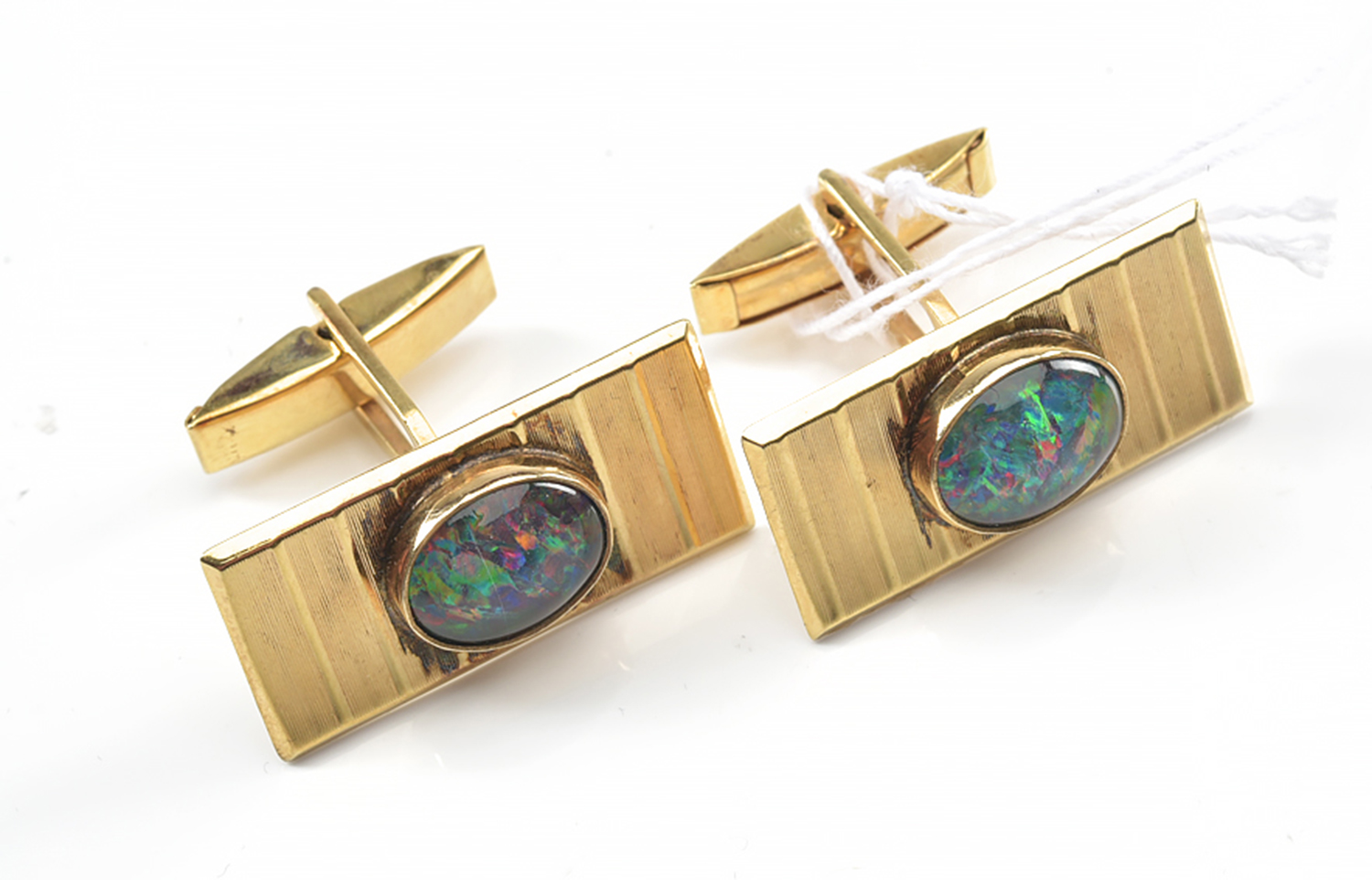 A PAIR OF OPAL DOUBLET CUFFLINKS IN 9CT GOLD, 8.7GMS