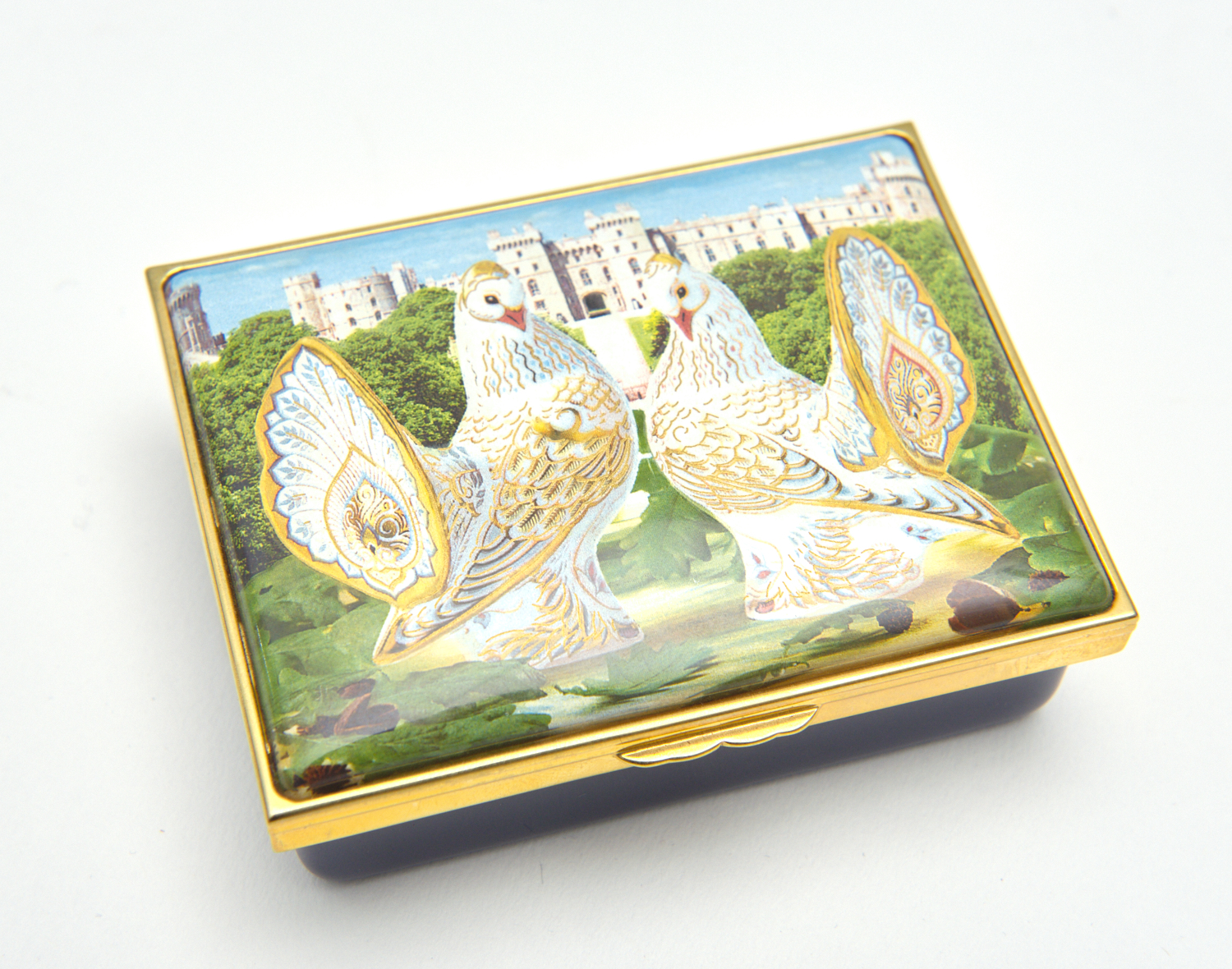 A BOXED ROYAL CROWN DERBY HALCYON DAYS ENAMEL PILL BOX 'GOVIERS DOVES'