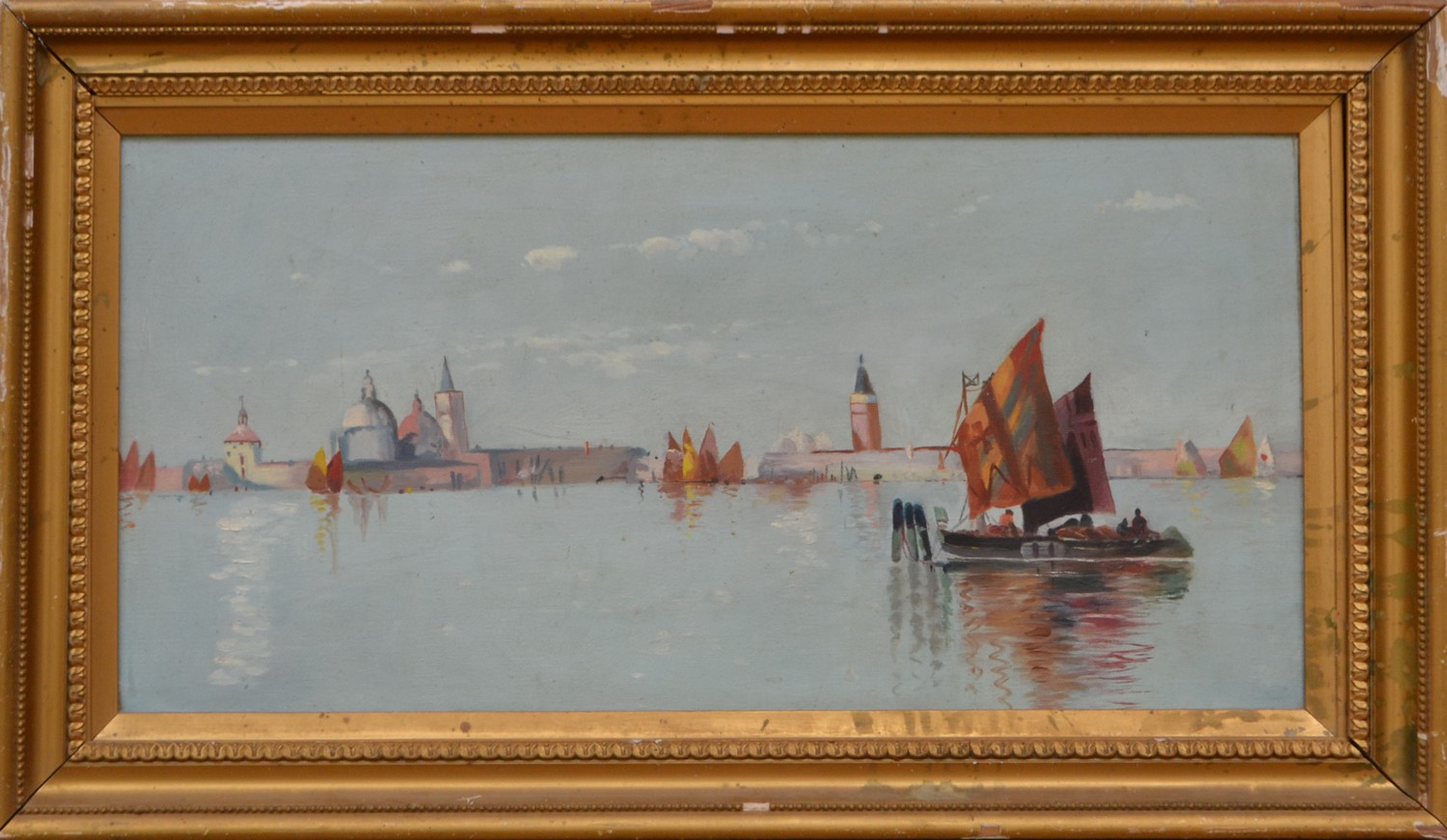 ARTIST UNKNOWN, HARBOUR SCENE, POSSIBLY EUROPEAN, OIL ON CANVAS, 29 X 60CM, FRAME SIZE: 42 X 73.5CM, CONDITION: DISCOLOURATION AND VERY WORN FRAME, LEONARD JOEL DELIVERY SIZE: MEDIUM