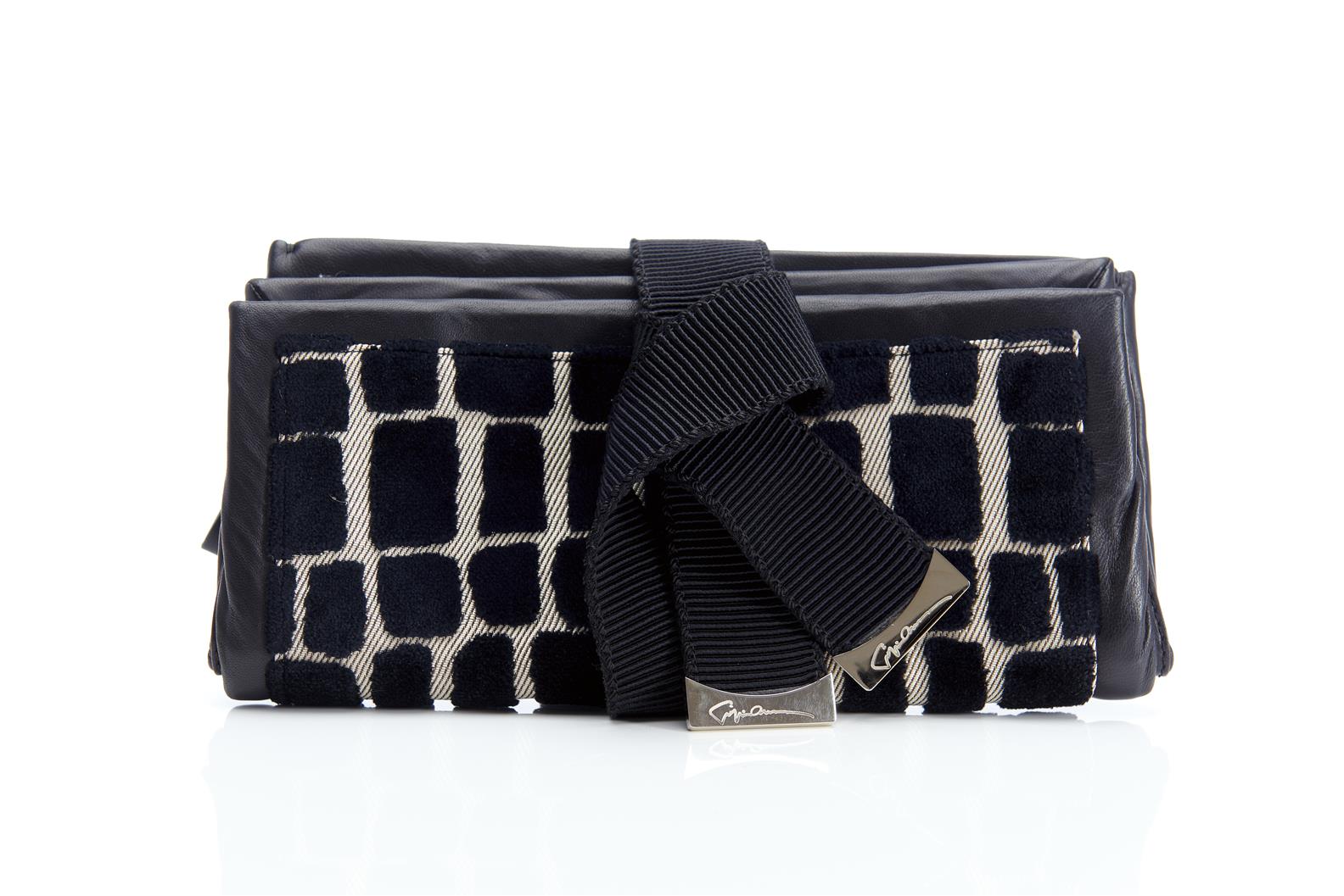 Styled in flocked silvered canvas with black leather and signed white metal capped grosgrain tie, 25cm square extended.