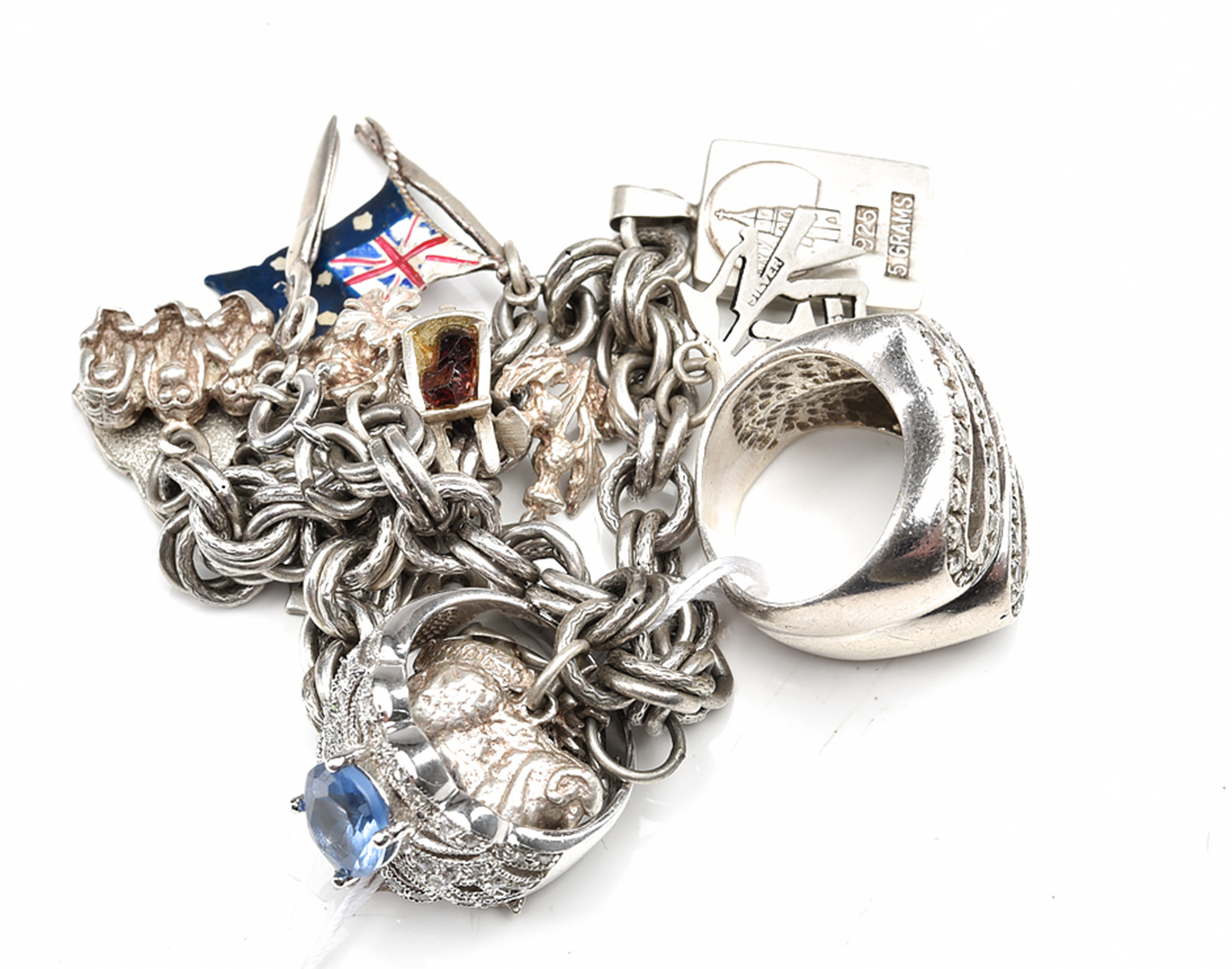 A COLLECTION OF JEWELLERY INCLUDING A CHARM BRACELET IN STERLING SILVER (TOTAL LENGTH 210MM) AND TWO PASTE SET RINGS (SIZE L-M)
