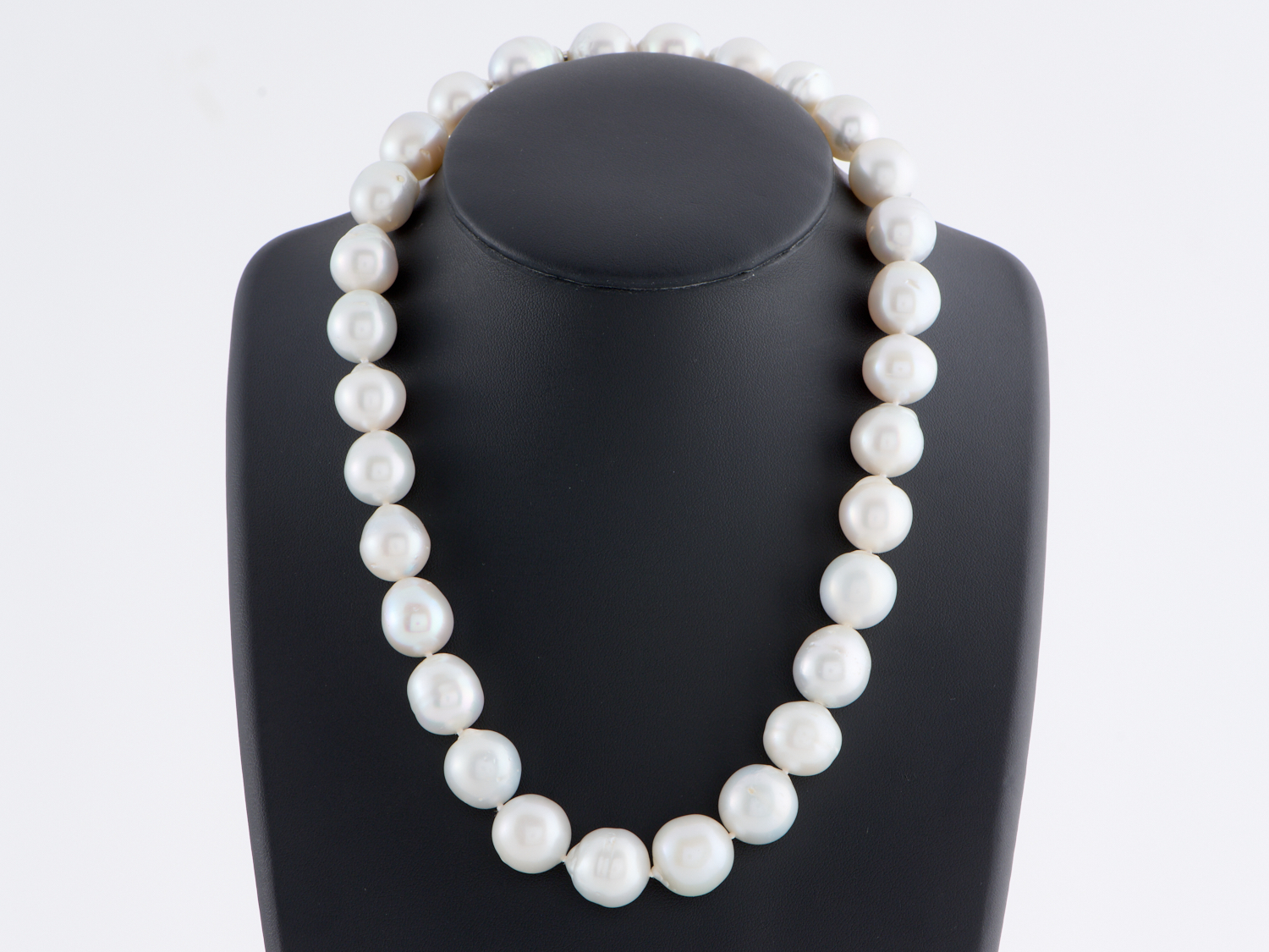 A STRAND OF SEMI BAROQUE SOUTH SEA PEARLS (14 - 16MM) IN SILVER WHITE HUES, TO A BAYONET CLASP IN 18CT WHITE GOLD, TOTAL LENGTH 50CMS