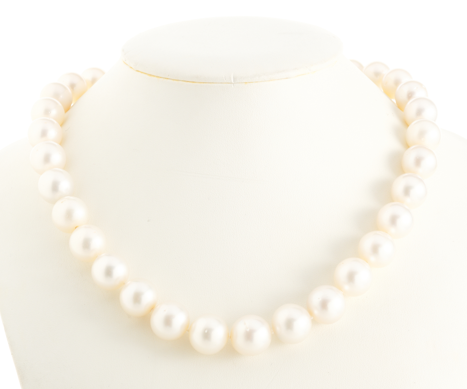 A STRAND OF SOUTH SEA PEARLS F CREAM WHITE HUES MEASURING APPROXIMATELY 13.0 - 15.0MM, TO A DIAMOND SET BALL CLASP IN 18CT GOLD.