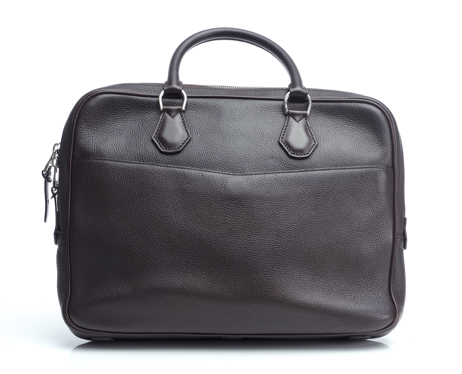 Styled in chocolate brown leather with white metal hardware, 37 x 26 x 6cm.
