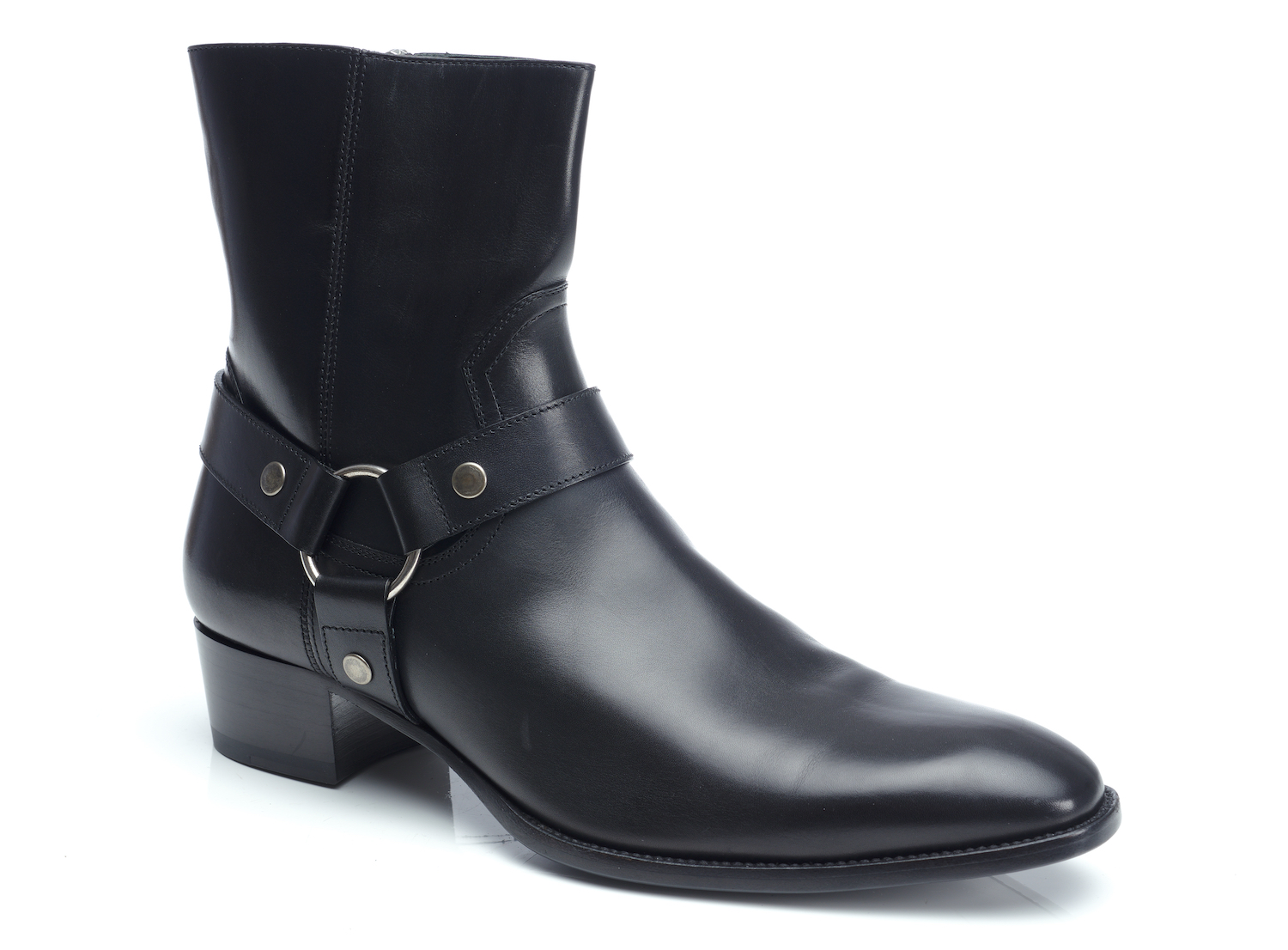 Styled in black leather with white metal zip and strap detail, labelled size 43.