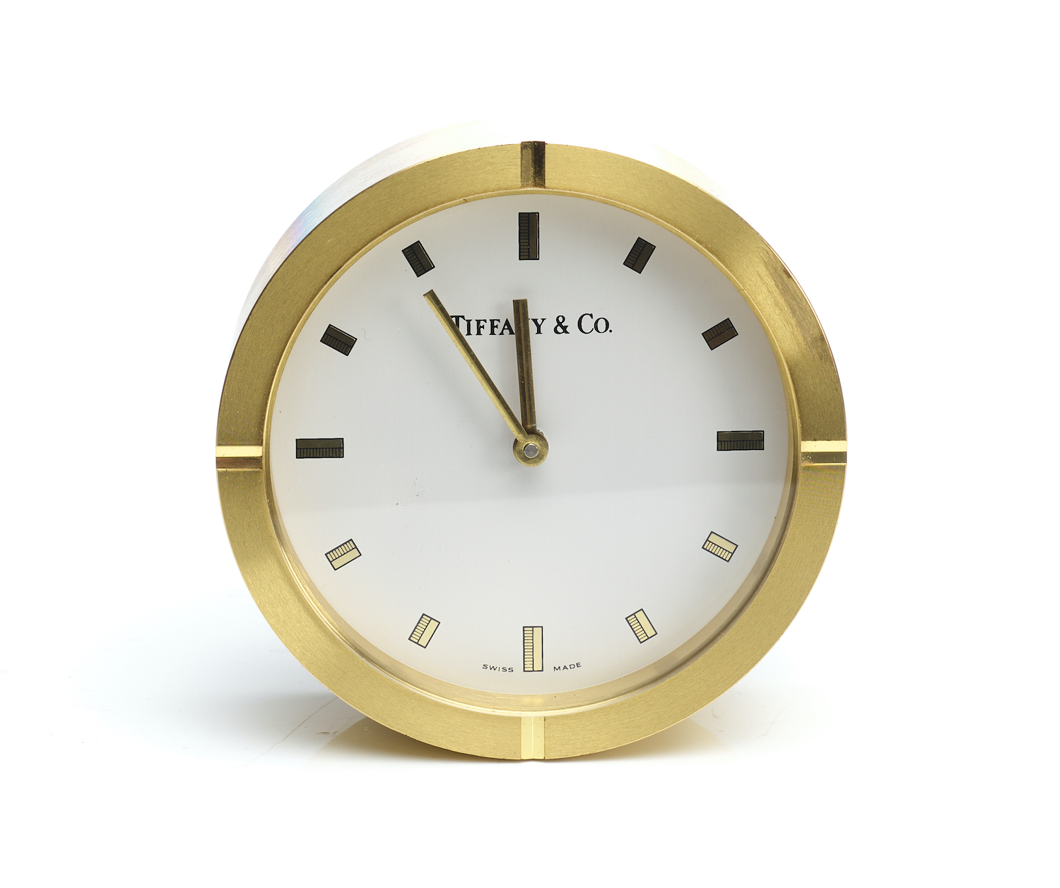 Quartz movement, white circular dial with gold batons, gold metal case, diameter 80mm.