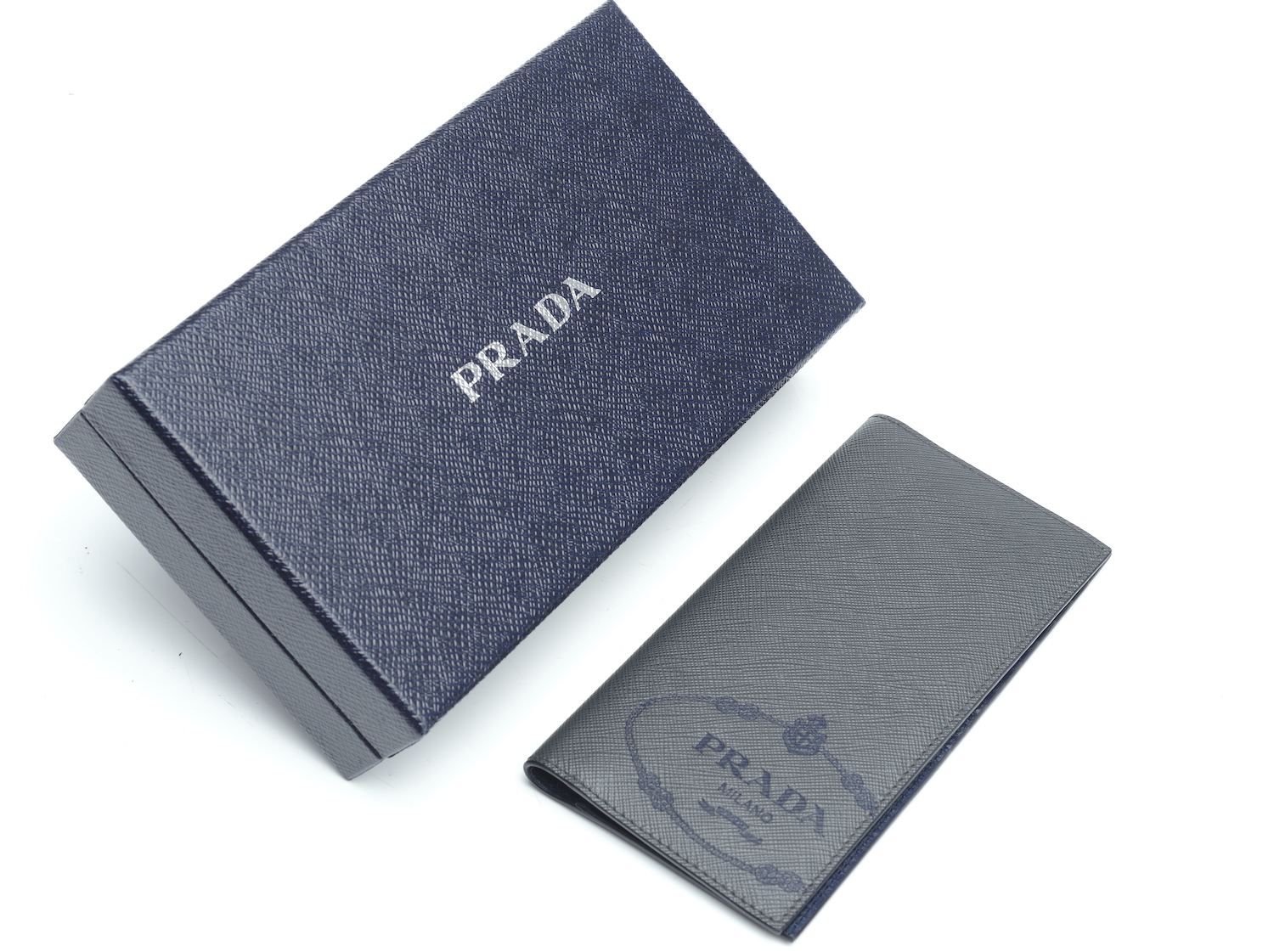 Styled in grey textured leather with eighteen card compartments and two bill compartments, 8 x 17cm, boxed.
