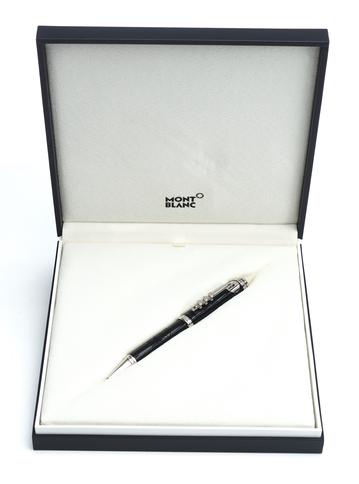 From the 'Great Characters' series, the Miles Davis ballpoint pen features platinum coated clip with finger valve detail, series number 114346, individual number MBMG51LRS, boxed with booklet.