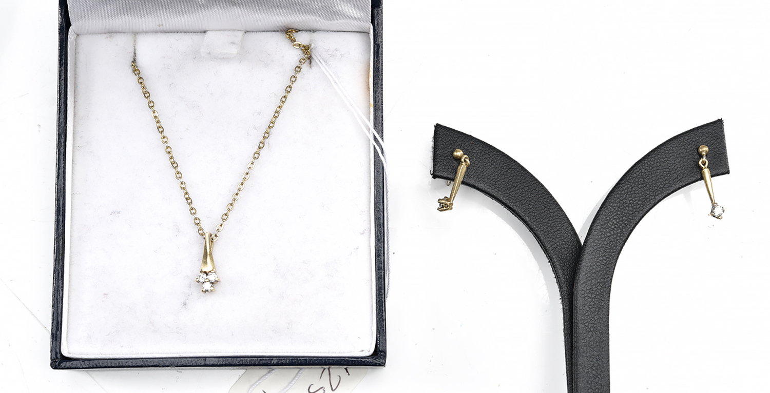 A DIAMOND SET NECKLACE IN 9CT GOLD, TO A GOLD PLATED CHAIN, TOGETHER WITH A PAIR OF STONE SET EARRINGS