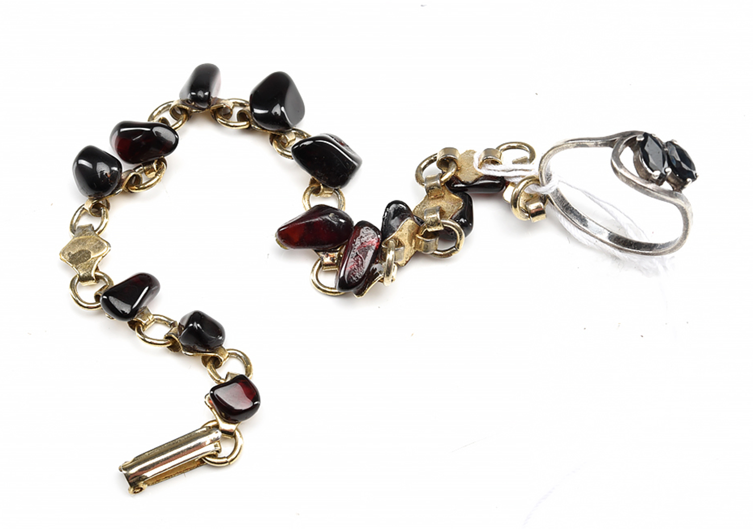 A TUMBLED GARNET BRACELET, TOGETHER WITH A SAPPHIRE RING IN SILVER, A/F