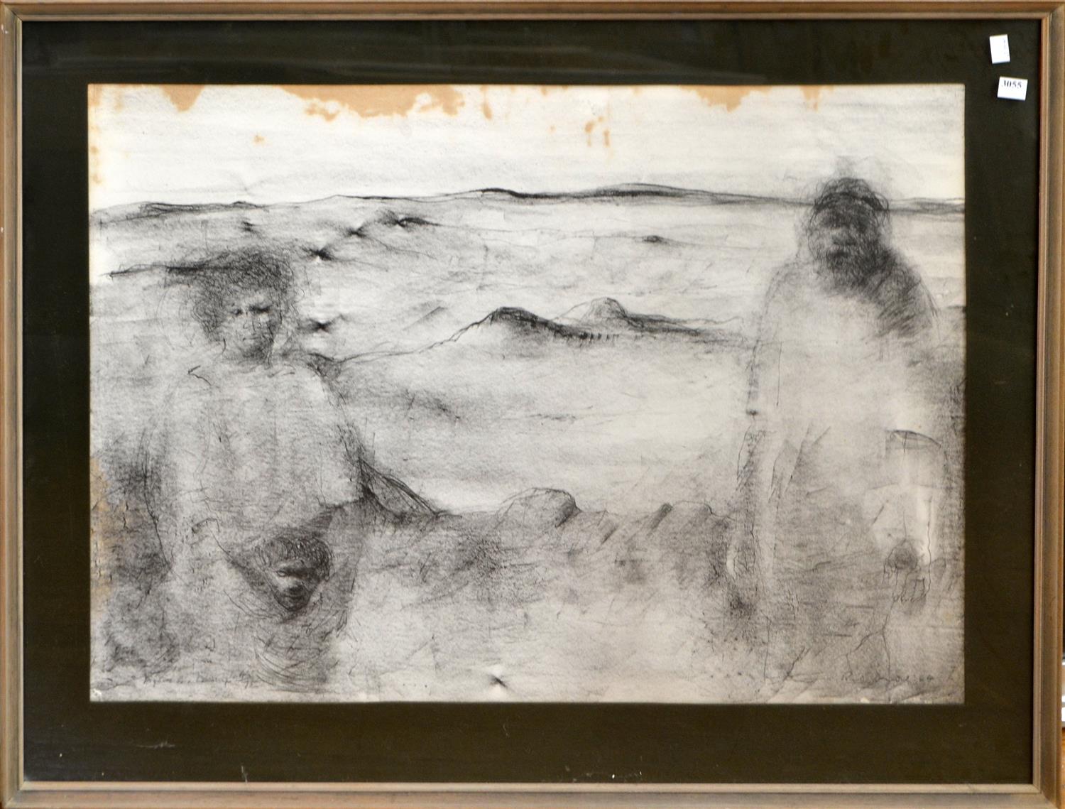 RUSSELL DRYSDALE, FIGURES IN LANDSCAPE 1964, LITHOGRAPH 4/75, 57 X 78CM, FRAME SIZE: 74 X 96CM, CONDITION: BROWN STAINING ACROSS TOP HALF OF IMAGE AND LOWER LEFT CORNER. LEONARD JOEL DELIVERY SIZE: MEDIUM