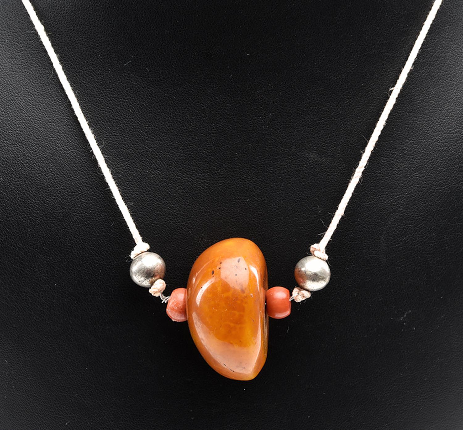A RECONSTITUTED AMBER, CORAL AND SILVER NECKLACE