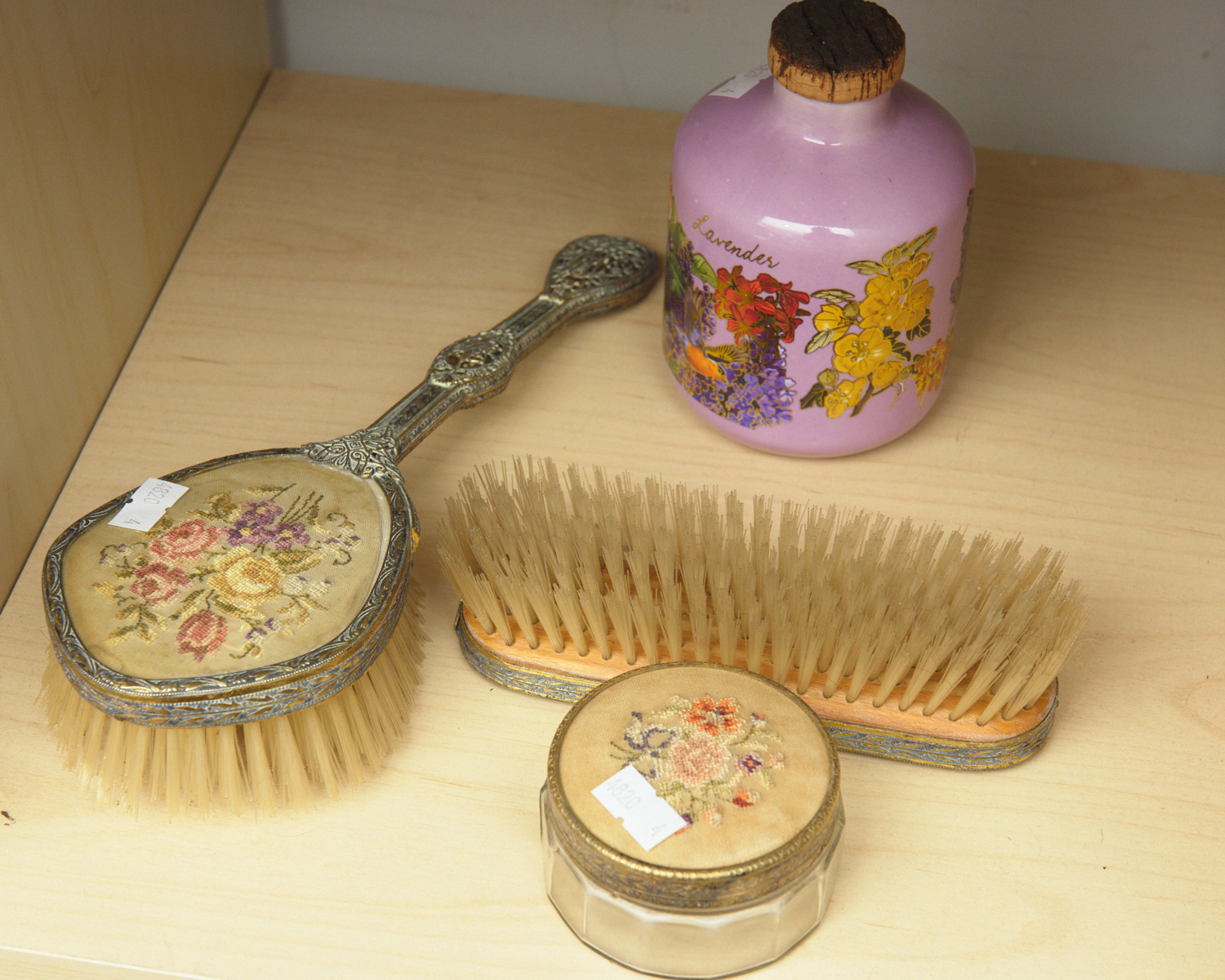 THREE PETIT POINT DRESSING TABLE ACCESSORIES INCLUDING A JAR AND TWO BRUSHES AND A PORCELAIN POT