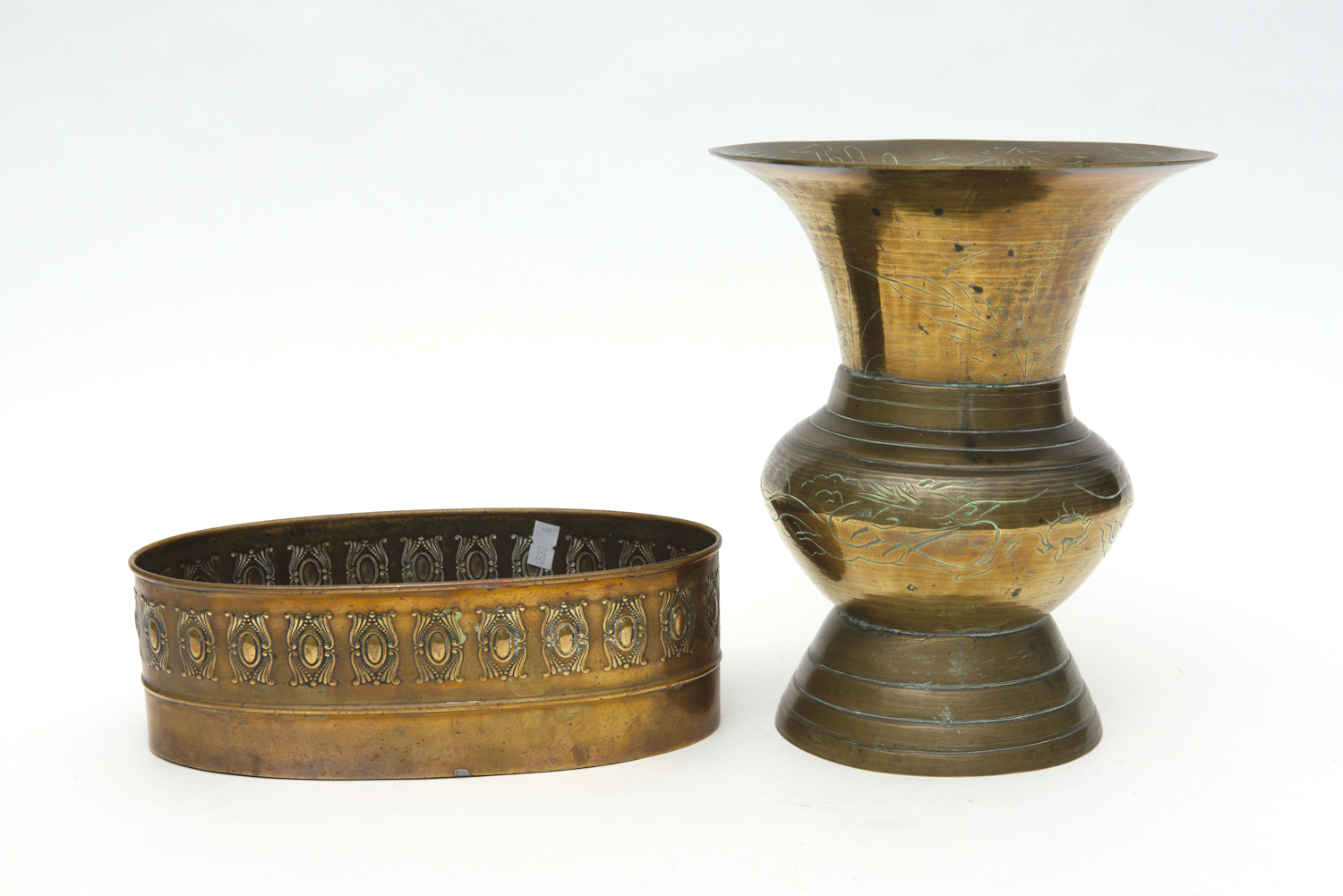 A BRASS VASE WITH A FLARED RIM AND A FLORAL EMBOSSED JARDINIERE