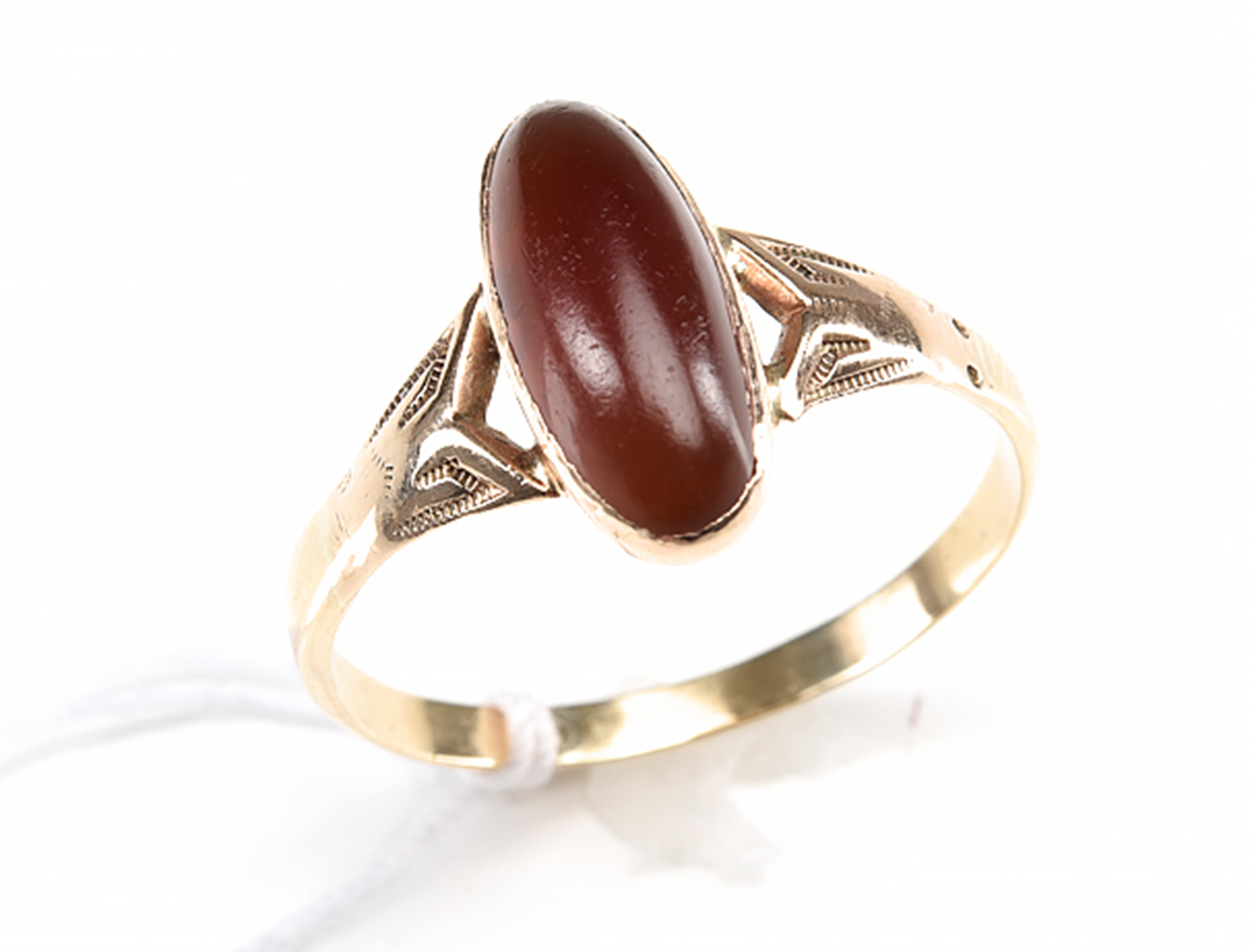 Stone secure in its setting, some minor abrasions to the carnelian and a small chip near the bezel setting. Band shows wear conducive with age.