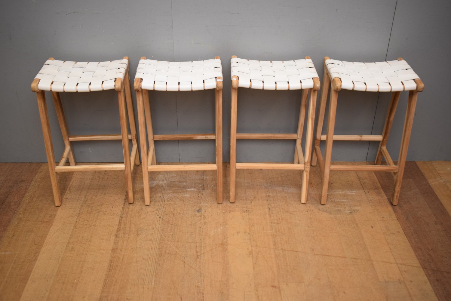 FOUR TEAK AND LEATHER BAR STOOLS (69H X 42W X 36D CM)