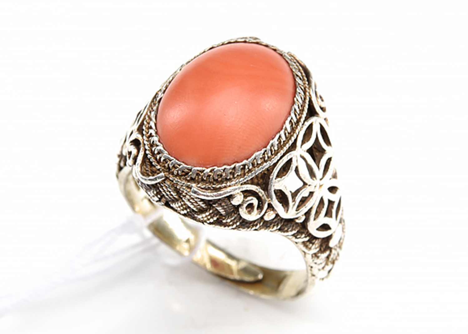 A CABOCHON CORAL RING IN SILVER, SIZE O