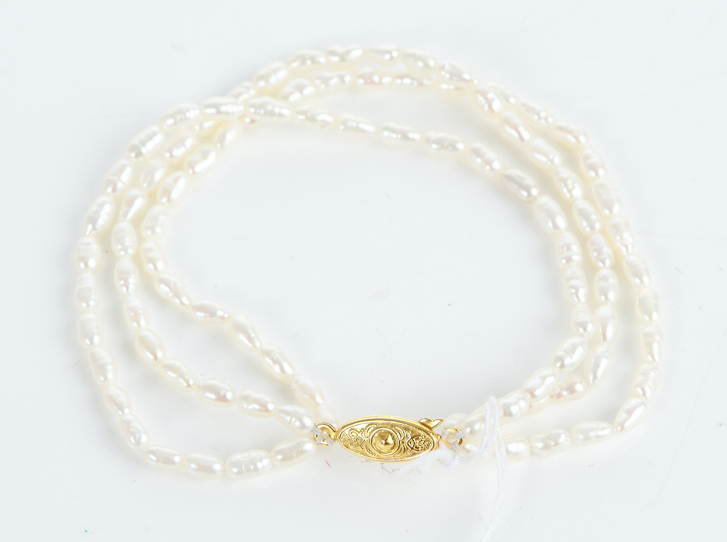 A TRIPLE STRAND FRESHWATER PEARL BRACELET, TO A GOLD PLATED CLASP, TOTAL LENGTH 19CM