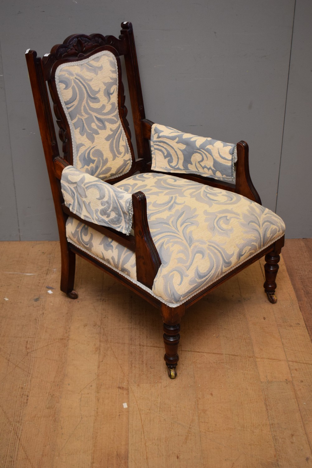 AN EDWARDIAN SITTING CHAIR WITH BLUE AND GREEN UPHOLSTERY (96H X 67W X 66D CM)