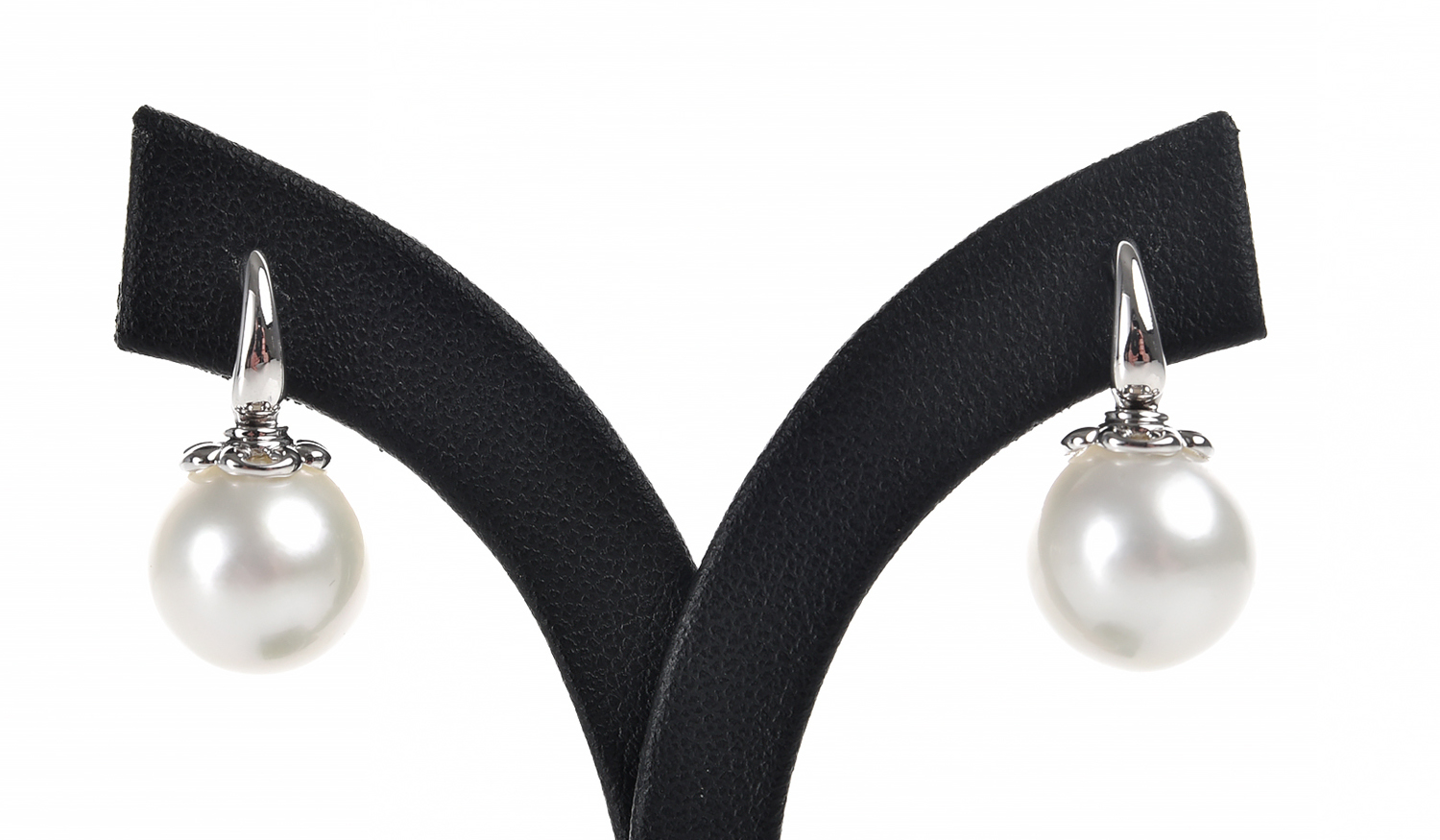 A PAIR OF SOUTH SEA PEARL DROP EARRINGS IN 18CT WHITE GOLD, THE PEARLS MEASURING 11.5MM, TO POST AND BUTTERFLY FITTINGS, LENGTH 21MM