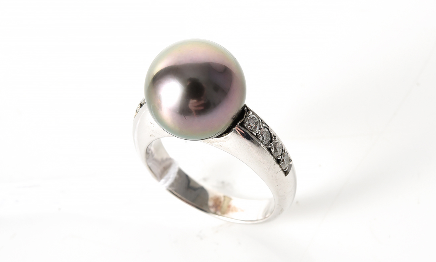 A TAHITIAN PEARL AND DIAMOND RING IN STERLING SILVER, THE PEARL MEASURING 12.72MM AND SHOWING NICE AUBERGINE HUES, SIZE P