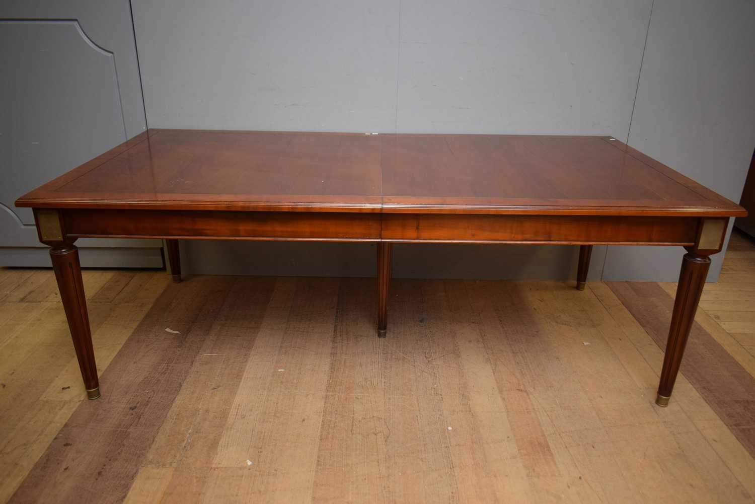 A FRENCH CHERRYWOOD EXTENSION DINING TABLE WITH BRASS DETAILING AND TWO EXTENSION LEAVES (77H X 220W X 110D CM) (PLEASE NOTE THIS HEAVY ITEM MUST BE REMOVED BY CLIENTS OR CARRIERS AT THE CUSTOMERS EXPENSE. LEONARD JOEL STAFF CANNOT ASSIST CARRYING THIS ITEM)