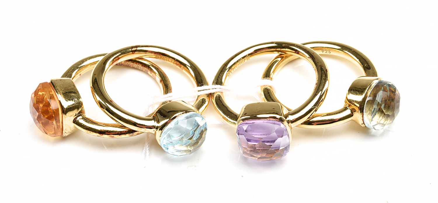 A COLLECTION OF FOUR RINGS IN SILVER GILT, SET WITH AMETHYST, LONDON BLUE TOPAZ, CITRINE, TOURMALINE