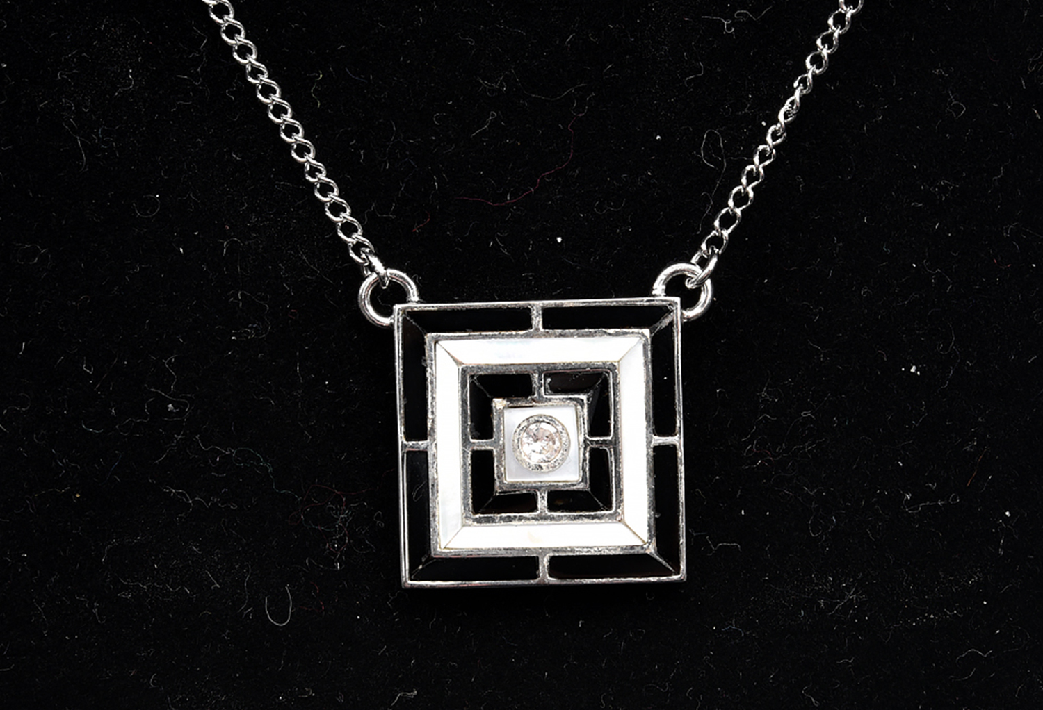 AN ART DECO STYLE PENDANT SET WITH ONYX, MOTHER-OF-PEARL AND ZIRCON IN STERLING SILVER, TOTAL LENGTH 520MM (ADJUSTABLE)