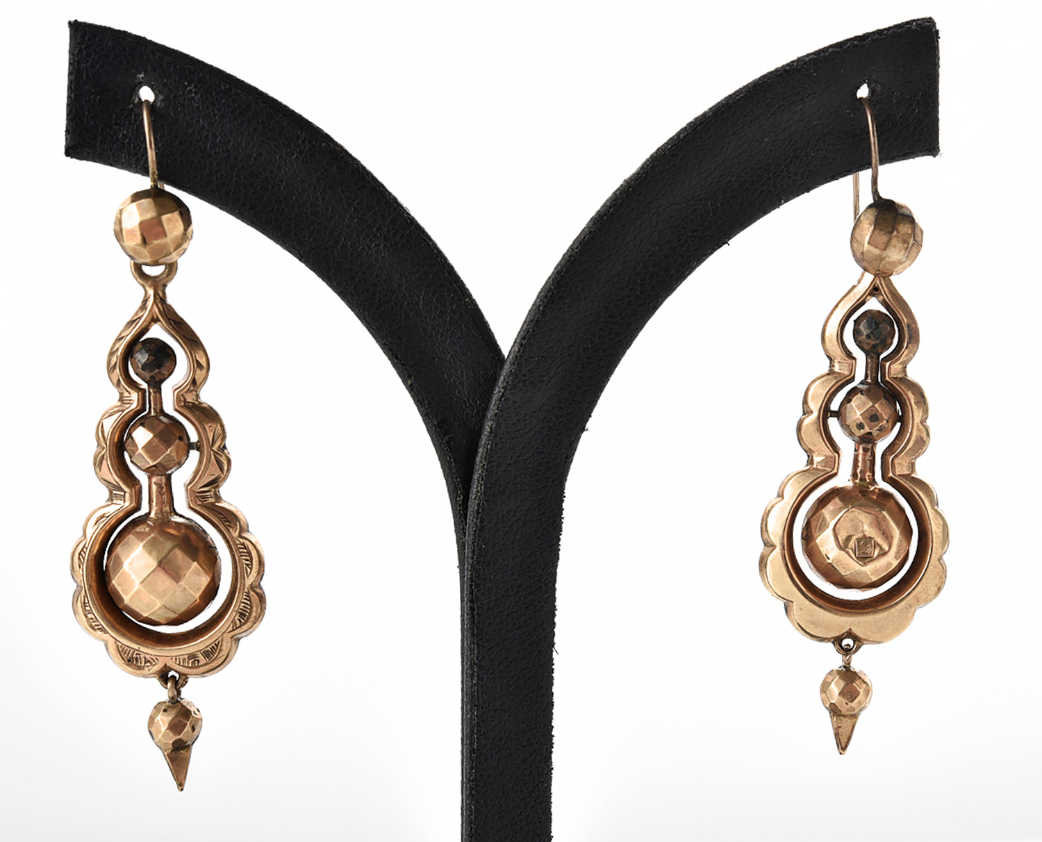 A PAIR OF ANTIQUE DROP EARRINGS IN 9CT GOLD, TO SHEPHERD HOOK FITTING, TOTAL LENGTH 60MM, 4.5G, A/F
