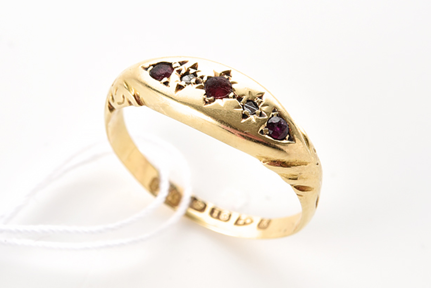 AN ANTIQUE RUBY AND DIAMOND RING IN 18CT GOLD, HALLMARKED CHESTER 1905, RING SIZE K, 1.5GMS