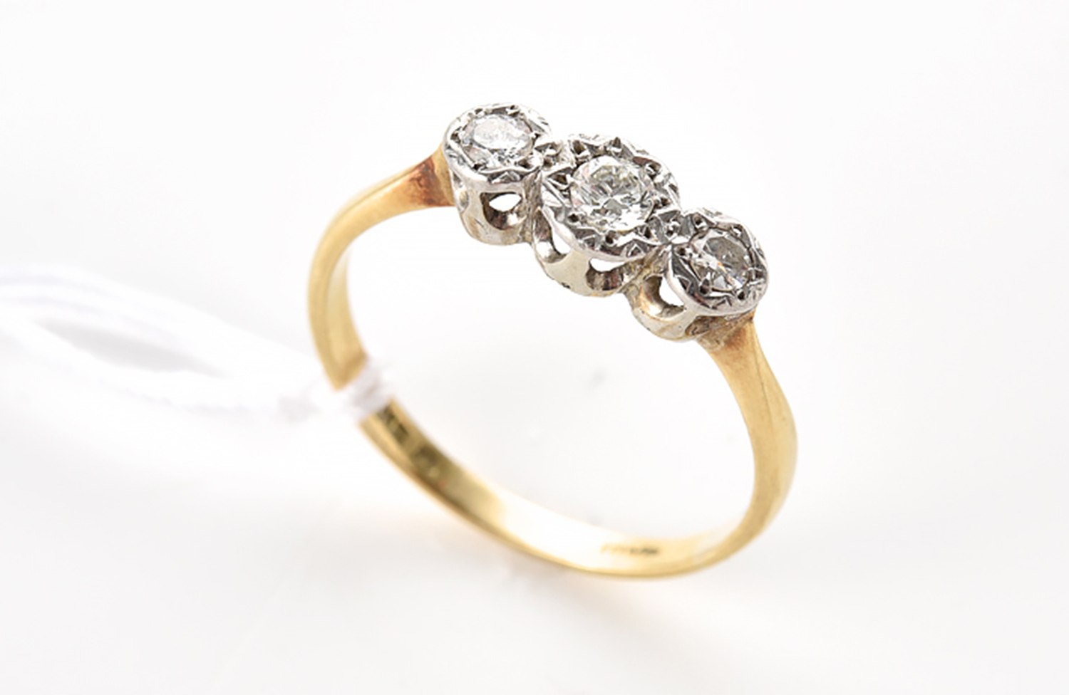 A VINTAGE THREE STONE DIAMOND RING IN 18CT GOLD AND PLATINUM, SIZE M, 1.6GMS