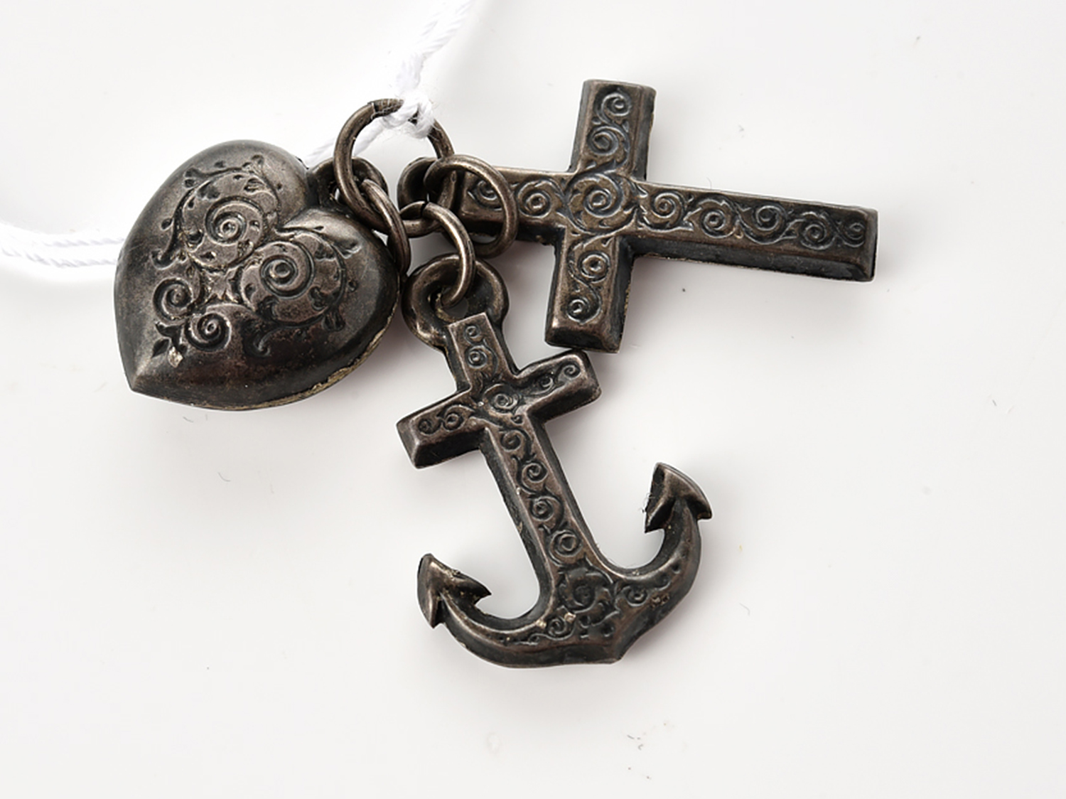 A COLLECTION OF THREE ANTIQUE FAITH, HOPE AND CHARITY CHARMS IN SILVER