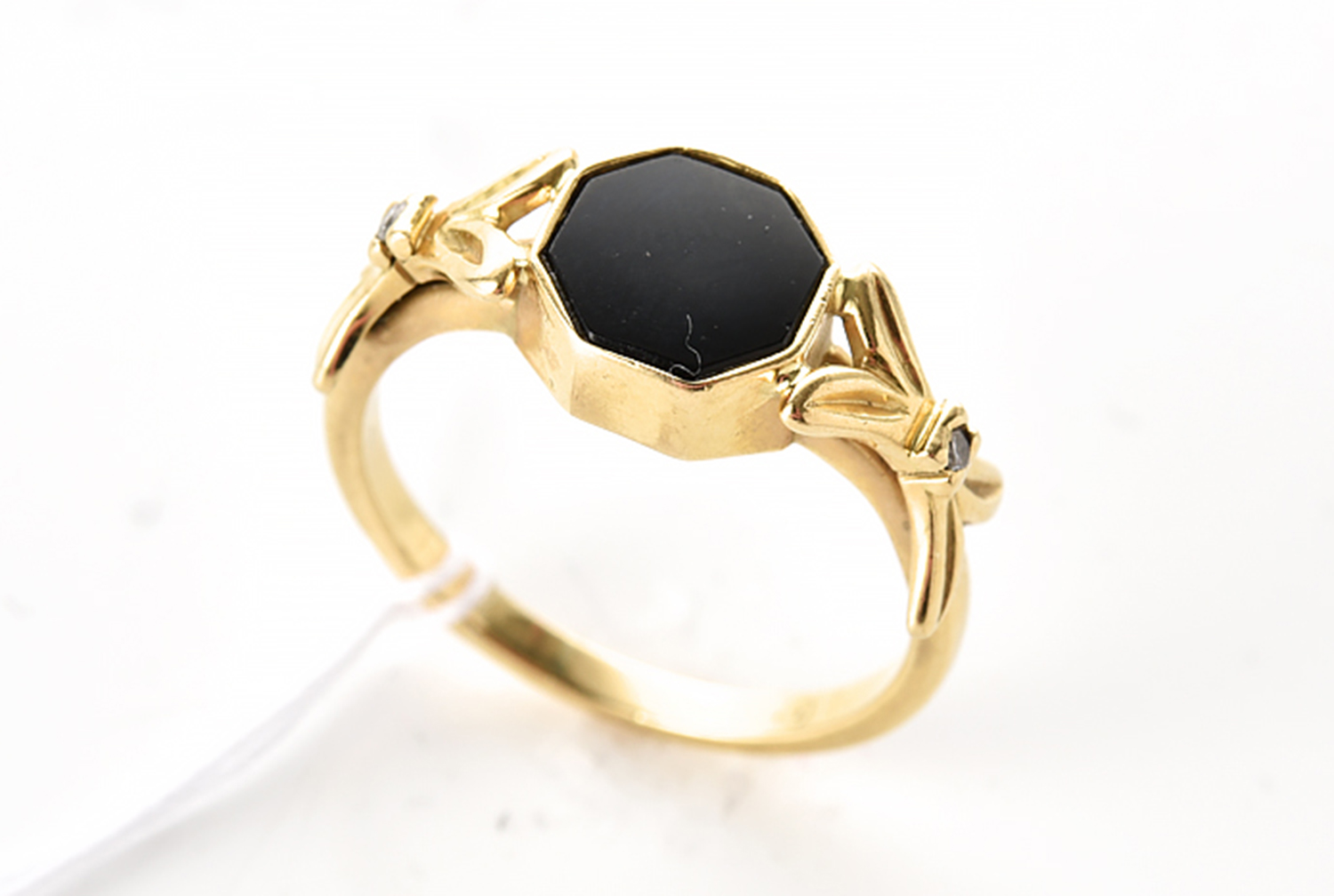 AN ONYX AND DIAMOND RING IN 9CT GOLD, RING SIZE O-P, 4GMS